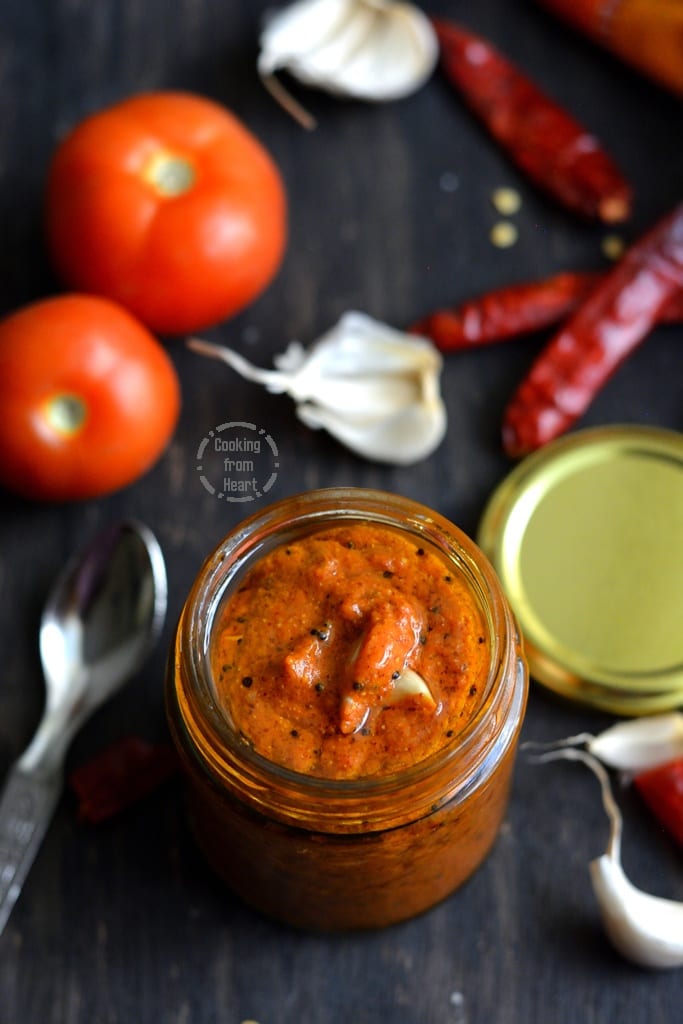 Summers mean only one thing in our part of the world – the sun is shining bright and it is tiringly hot. The days seem really long with the scorching heat and the only way to get through the day is by drinking a lot of fluid – juices, milkshakes and of course water. You definitely cant say no to homemade ice creams and lollies too. Although it is unbearably hot, we still look forward to it as there are a lot of summer goodies. Apart from the cool drinks and frozen treats, summers call for homemade pickles and fryums. I am going to share three pickle recipes that we made at home this summer so far and the first one is this really simple yet flavorful Tomato Avakaya recipe.