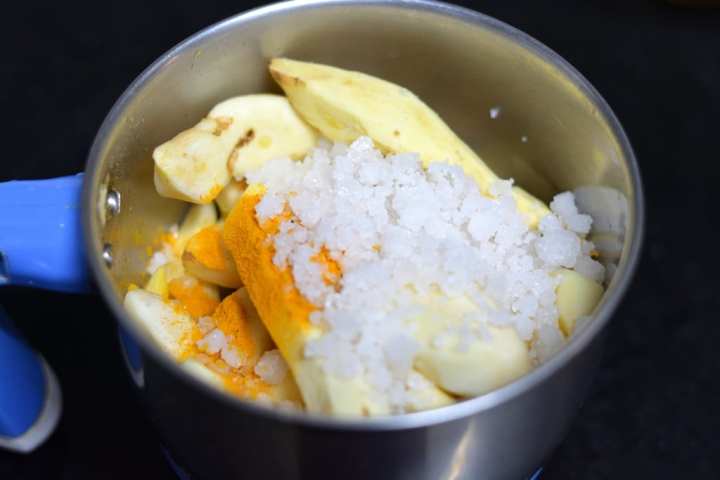 2. In a mixer jar add chopped mango ginger, turmeric powder and salt as needed.