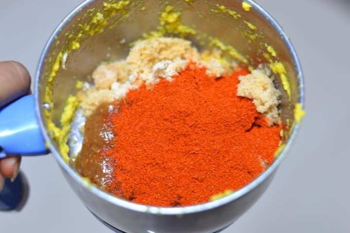 - Add powdered jaggery and tamarind pulp. Pulse again for 1 or 2 times. Next add red chilli powder and pulse again until it is evenly mixed.