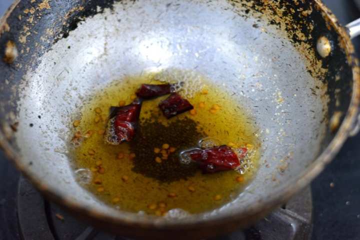 6. Meanwhile heat oil in a pan. Add mustard seeds, split dried red chillies and as they splutter, add asafoetida.