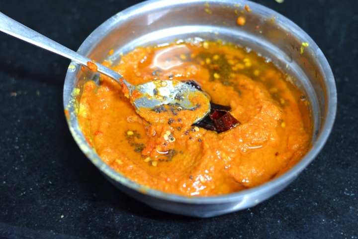 There are many ways to make this Mamidi Allam Pachadi and this one here is the easiest of all. There is literally no cooking anything at all. Just blend ingredients together, check for balance and temper it. Your pachadi or chutney is ready. It stores well for over a month in an airtight jar in the fridge and it goes really well with Sambar rice, Rasam rice and Curd Rice. I just love it with hot idlis too!