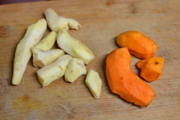 Wash both the yellow and white turmeric thoroughly until all the dirt is removed. Peel off the skin.