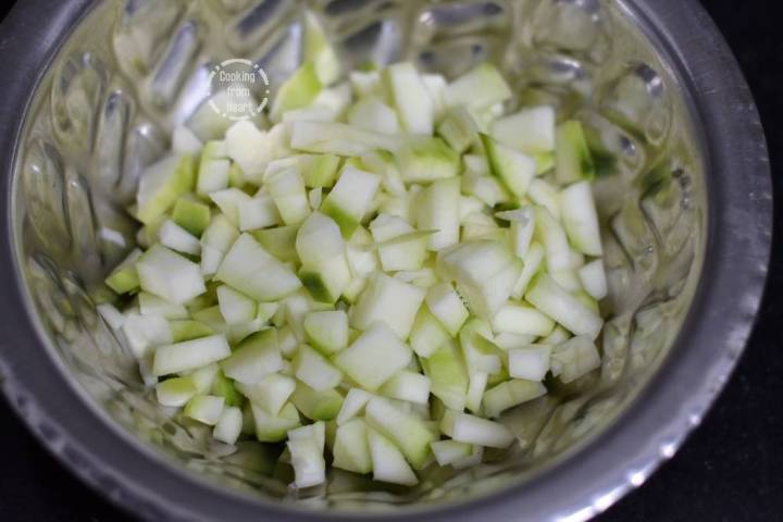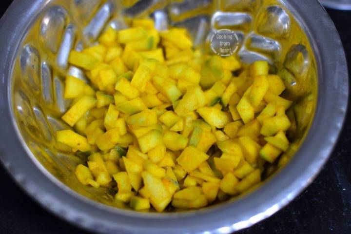 Add ½ cup finely chopped mangoes in a stainless steel/glass bowl. I recommended removing raw mango skin, but it is optional.