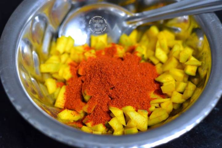 - Adding salt and turmeric powder to the cut mangoes brings out the moisture and when the mangoes are sour enough, it should produce pickling juices. For this instant version, you can either leave the mangoes for a while (1-8hrs/overnight) for the juices to be produced or make the pickle right away.