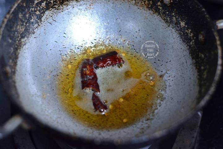 Meanwhile in a small pan, heat 1 tablespoon gingelly oil/sesame oil. Add ½ teaspoon mustard seeds, 6-8 fenugreek seeds, 1 dry red chilli cut into small pieces. As mustard seeds splutter, add ¼ teaspoon asafoetida. Remove from heat.