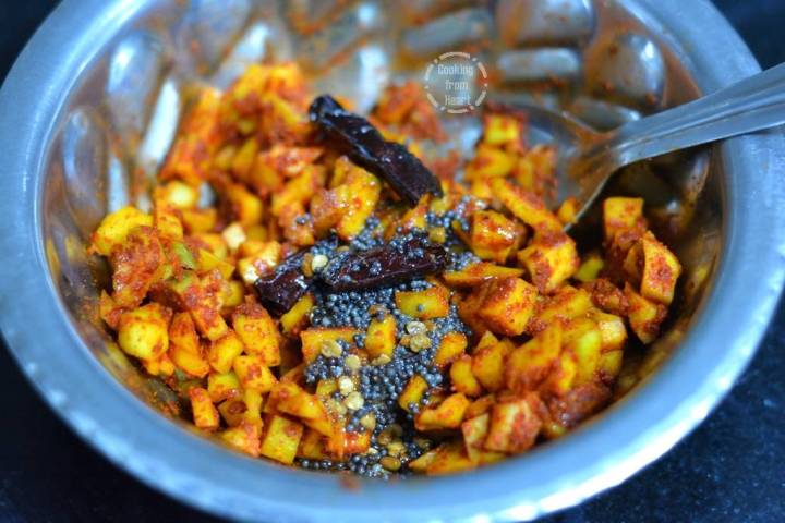 Once the tempering cools down completely, add it to the mango pickle. Mix well.