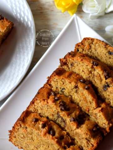 Eggless Whole Wheat Banana Chocolate Chip Cake