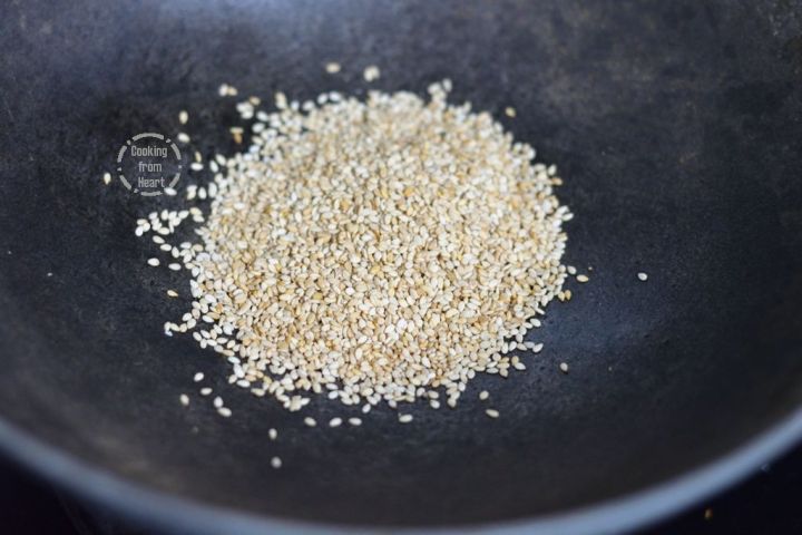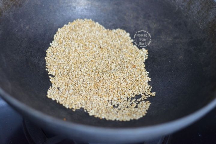 - In the same pan, dry roast ¼ cup sesame seeds on low flame.