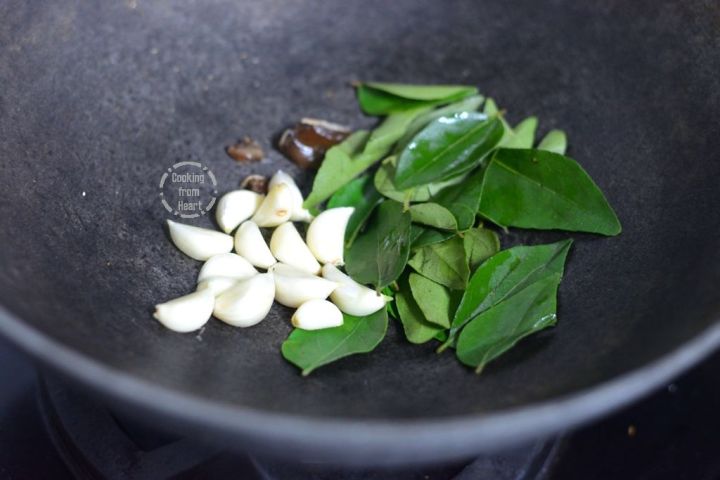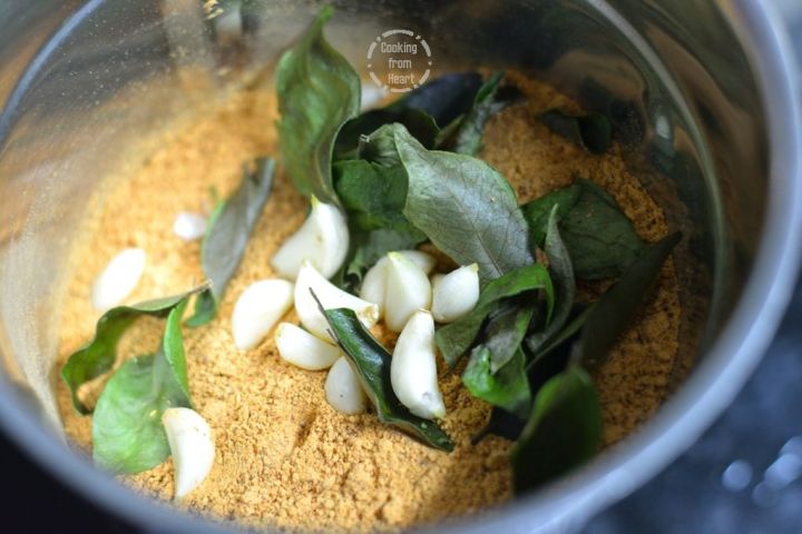 Grind into a coarse mixture and then add curry leaves and garlic cloves.