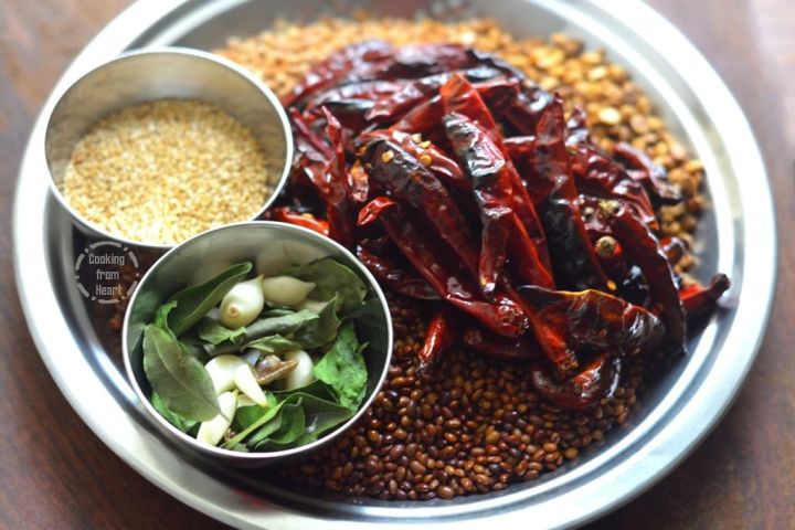 Using long stemmed spicy red chilli variety gives best flavor to the podi.