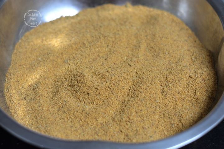 - Let the chutney powder cool down completely in a large bowl/plate.