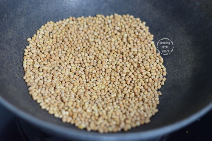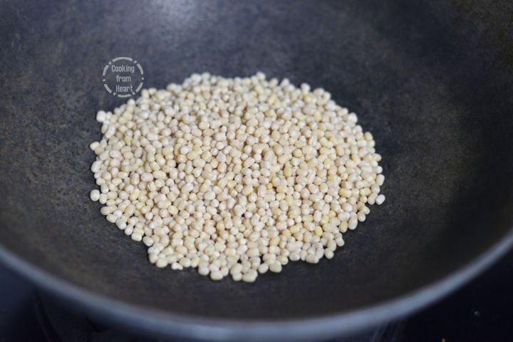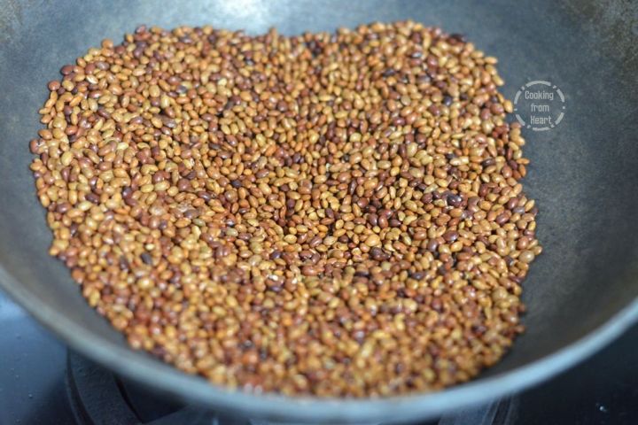 In about 5-7 mins, the horse gram changes color and is fragrant. Remove from heat.