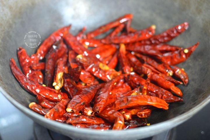 - Fry on low flame until the red chillies start to change color and are crisp & shiny. Remove from heat.