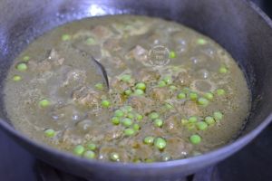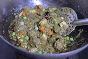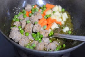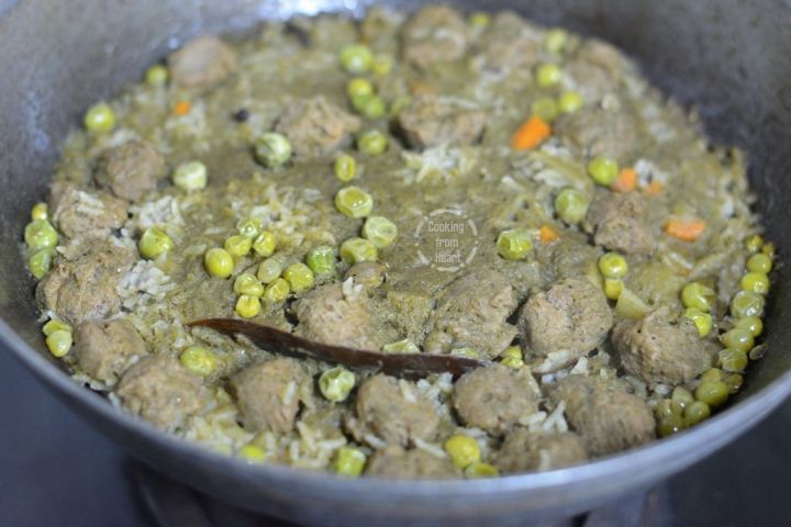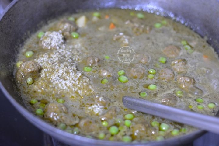 - Add 1 cup chopped vegetables (carrots, potatoes, French beans, fresh green peas) and soya chunks if using.