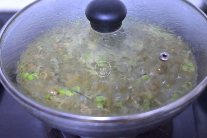 Cook it covered on medium flame for 5 mins. Then reduce the flame and cook on lowest heat for 10 mins. If making in pressure cooker, put on the weight and set it on medium flame for 5 mins. Set it to low flame and remove from heat in 9-10 mins or when you get 2 whistles (whichever happens earlier).