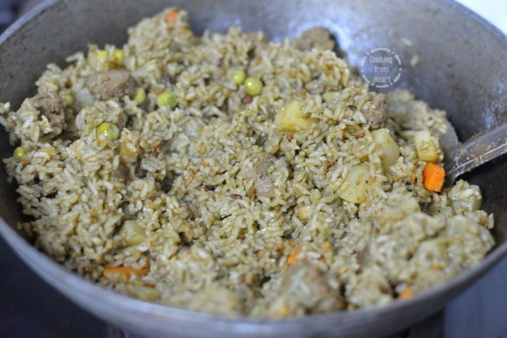 - Add the soaked rice and mix well.