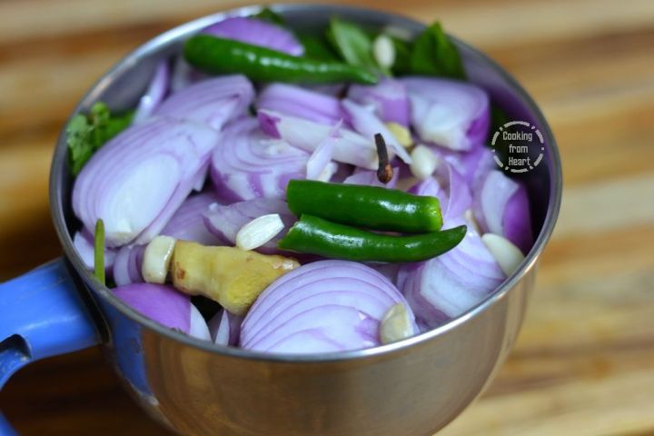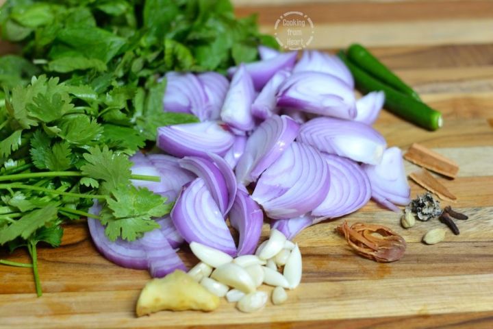 - In a blender add ⅓ cup coriander leaves, ⅓ cup mint leaves, 2 medium onions roughly chopped, 8-9 garlic pods, 3” ginger piece, 2 green chillies, 2 cloves, 2 cardamoms, 2” cinnamon, 1 stone flower, 1 mace flower.