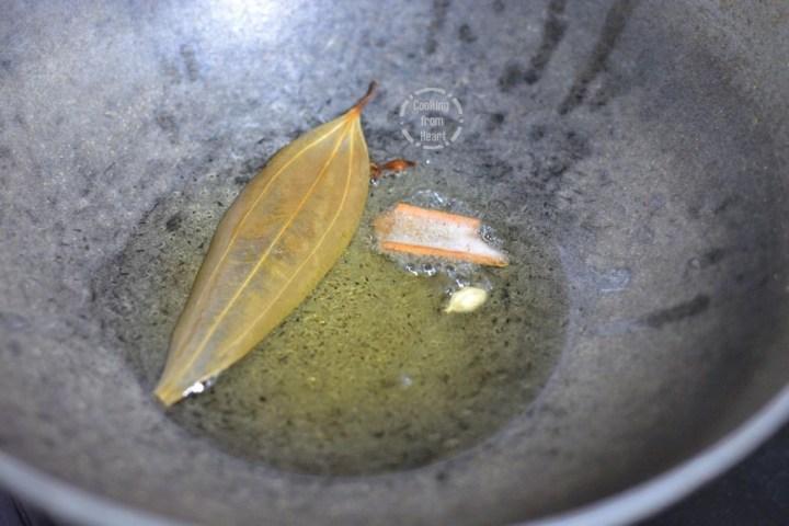 Meanwhile, soak washed 1 cup jeeraga samba (seeraga samba/jeera sala/jeera rice) rice in 2 cups of water for 15-20 mins. In a heavy pan, heat 2 tablespoon peanut oil. Add 2 dry bay leaves, 2 cloves, 1 cardamom and 2” cinnamon.