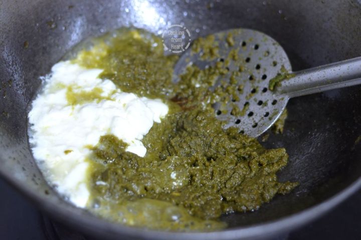 Next add 3 tablespoon thick fresh curd and cook for 3-4 mins.