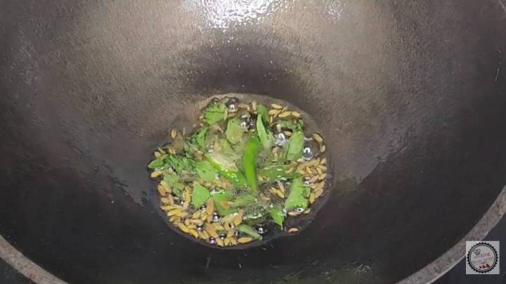 - In a heavy cast iron pan heat 3 teaspoon oil. Add ½ teaspoon fennel seeds. As they splutter, add fresh curry leaves and slit green chillies.