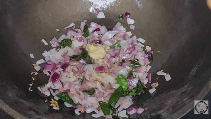 - Add 1 teaspoon ginger garlic paste and fry for 2-3 mins until there is no raw smell.