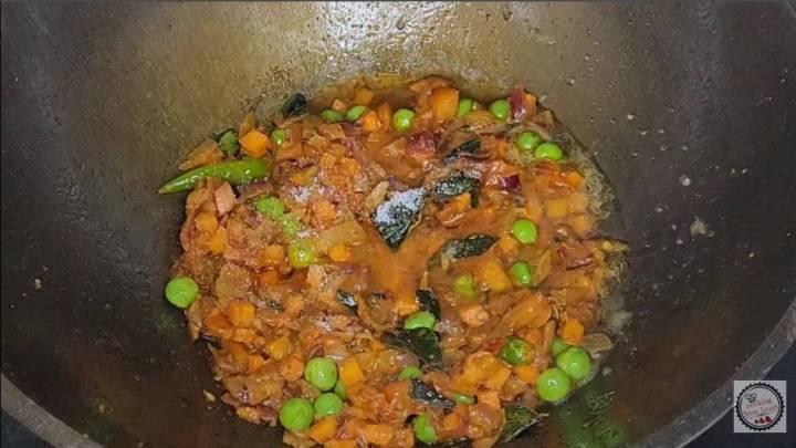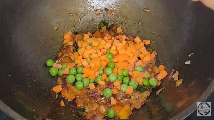 - Cook all the spice powders for 3-4 mins on low flame. Next add ¼ cup finely chopped carrots and 2 tablespoon fresh green peas (can use any veggies of choice). Cook for a couple of minutes.