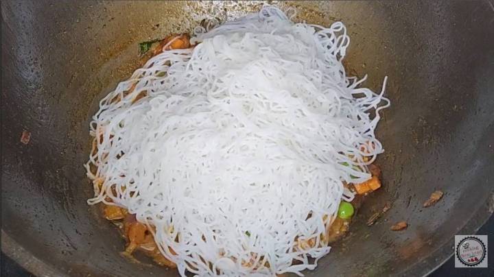 - Add 6-8 idiyappam (homemade/ready to use) into the pan. Gently scramble or cut into small pieces, while mixing it with the masala.