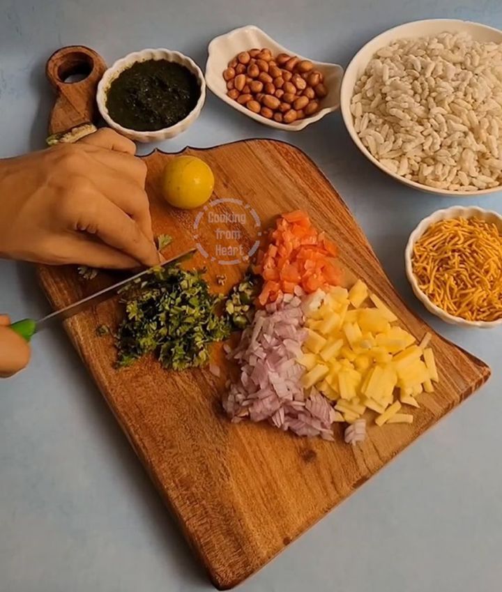 Prepare all the ingredients by chopping the required vegetables, spice powders and chutneys ahead of time on the serving table. It makes it easier for making the bhel in smaller portions to retain the crispness of the puffed rice.