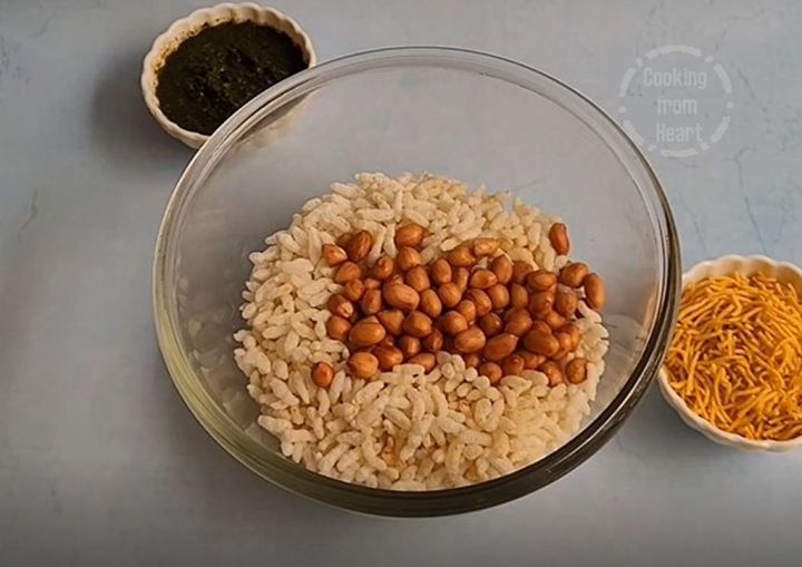 - In a mixing bowl add 2 cups salted puffed rice and ¼ cup peanuts.