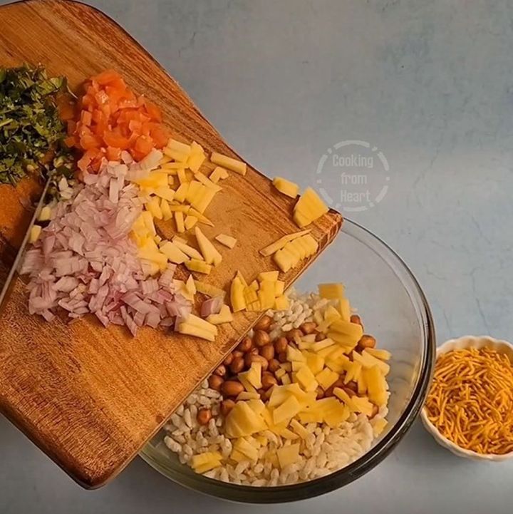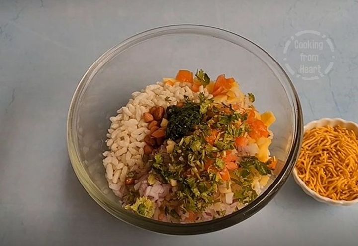 The choice and quantity of vegetables to add into bhelpuri is upto availability and taste preferences. The most basic ingredients needed for making mango bhel are raw mango, onions & tomatoes.