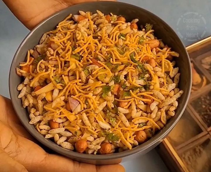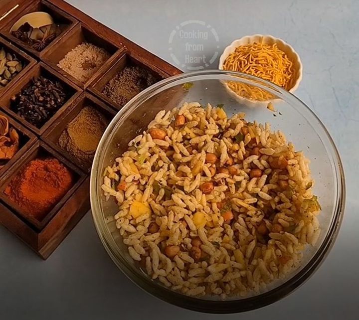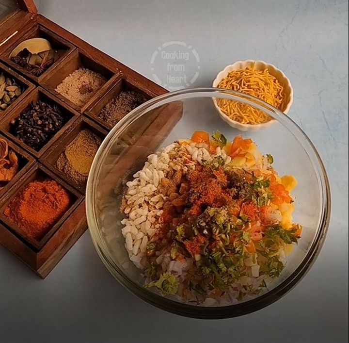 Use a deep pot/bowl for mixing the bhel so that the puffed rice doesn’t spill and can easily be mixed together with the veggies & spice powders.