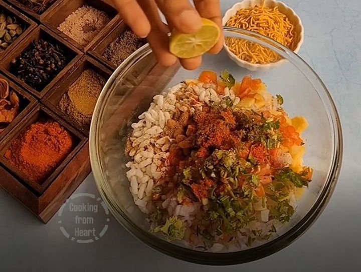 Freshly squeezed Lemon Juice is drizzled all over the bhel to finish it off and to add a tangy taste to it.