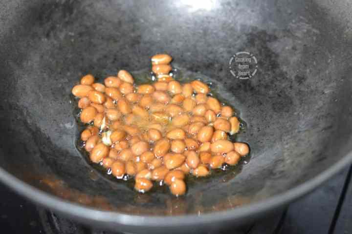 - In a heavy pan heat 3 teaspoon oil. Add ¼ cup peanuts and roast on low flame until they turn golden brown & crispy. It should take about 3-4 minutes, as the peanuts begin to pop.
