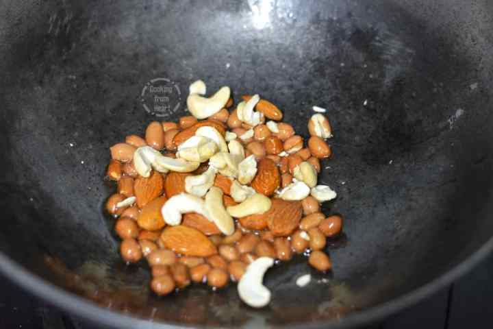 Next add 10-12 almonds and cashews, fry until they are golden brown and crisp.