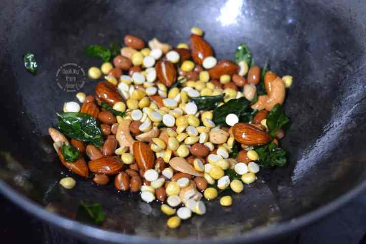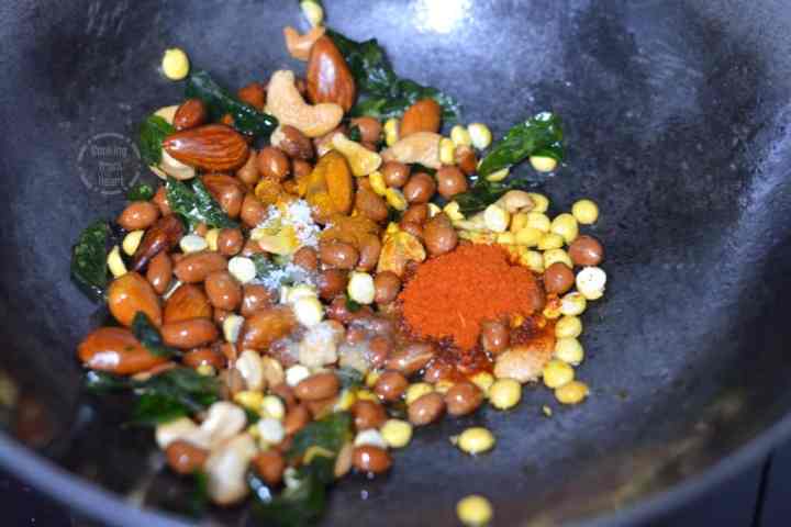 Peanuts, Cashews, Almonds and Roasted Gram Dal are added to give extra crunch to the mixture recipe. It can be customized to one’s taste preferences and availability.