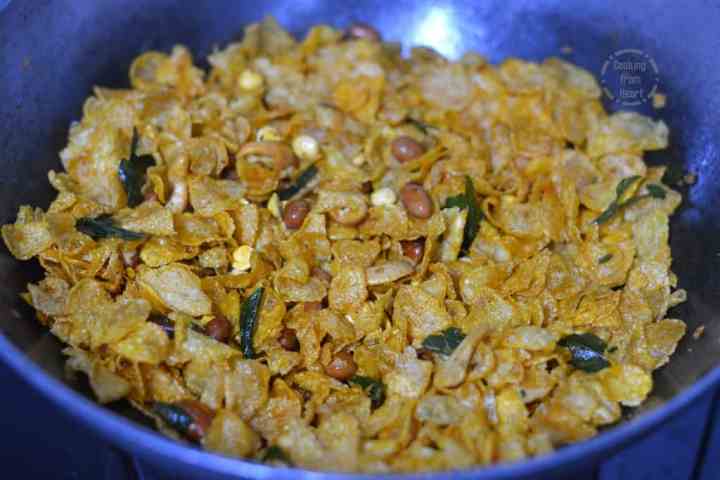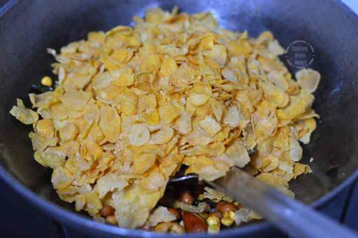 Using a heavy bottom pan will ensure even roasting of all the nuts and corn flakes. Always use low flame and continuously stir the nuts as they get roasted for even browning.