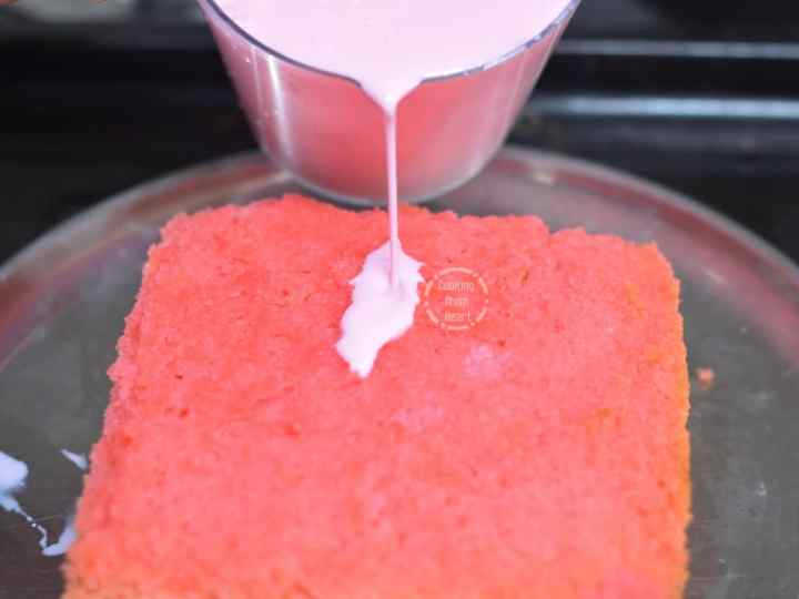 Gently pour over half of the liquid all over the cake when it is still warm. The cake soaks up the liquid immediately and give it a few seconds before pouring over again. It is to your preference if you want to use up all the liquid or save some for serving later. I kept aside half of the liquid in fridge to be served with the cake later.