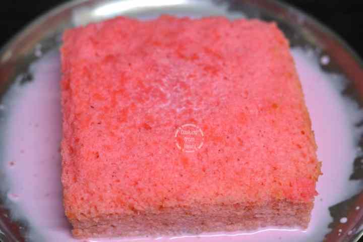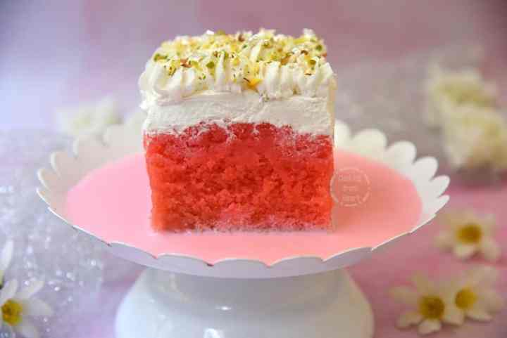 - Pour over ¼ cup of rose milk (or as preferred) around the cake and serve chilled!
