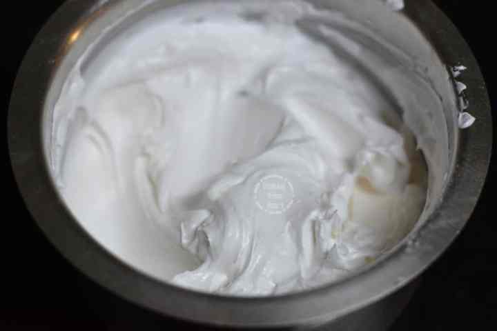 Meanwhile, whisk the whipping cream until soft peaks appear. I used whipping cream powder, so mixed 150 grams of powder with 100ml ice cold water and whisked until the cream had soft peaks. Set the cream in fridge for 15-20 minutes.