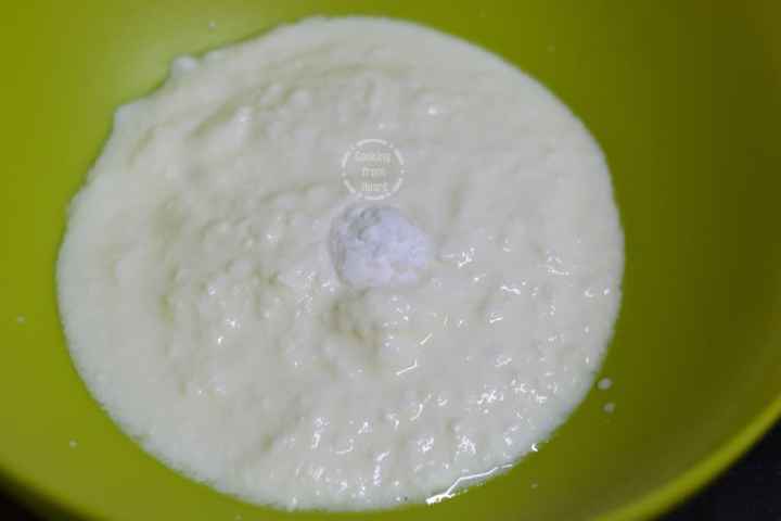 - Preheat the oven at 180°C for 10-15 mins. Line a 9x9 inch baking tray with parchment paper. In a mixing bowl add 1 cup fresh curd/plain yogurt with ½ teaspoon baking soda.