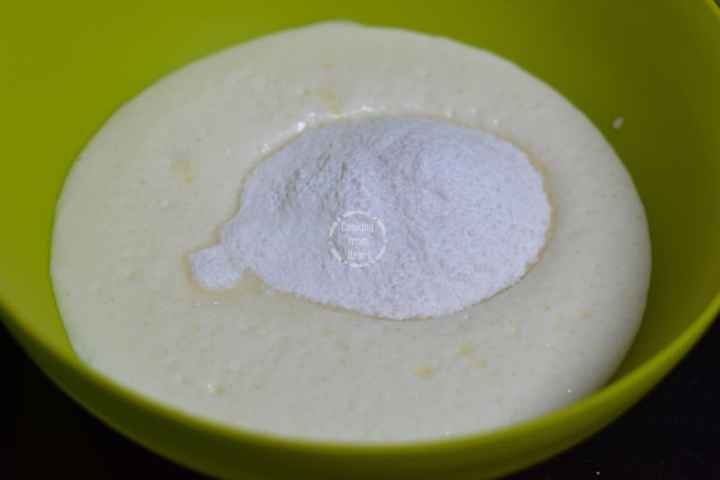 It is important to let the yogurt and baking soda work their magic together to make a frothy mixture. It is this mixture that adds lightness and airiness to the cake. Five minutes of rest time can do wonders here!